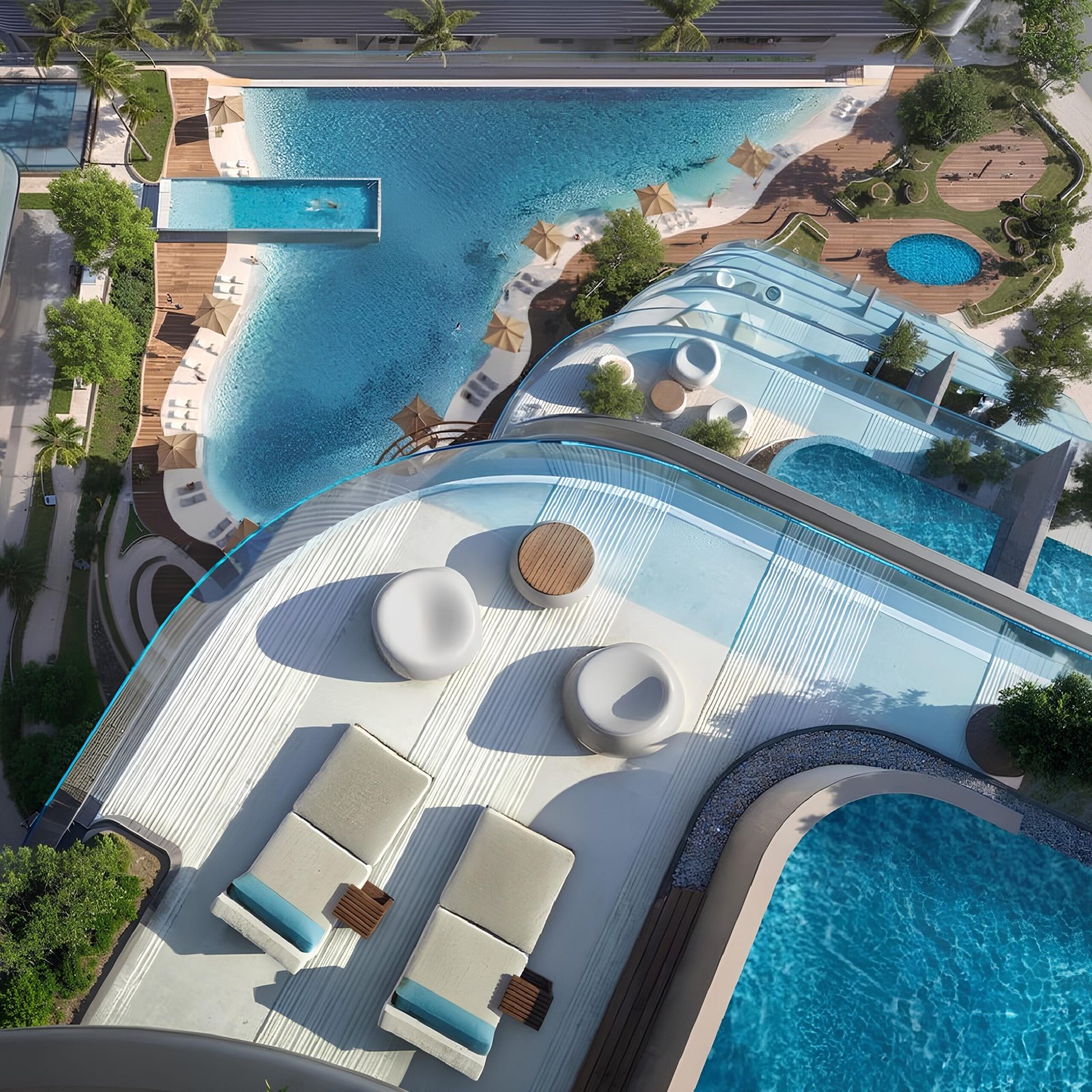 Binghatti Flare 02 features a man-made beach-style environment offering a refreshing and peaceful retreat within the property. It enhances the leisure experience and provides a resort-style atmosphere.