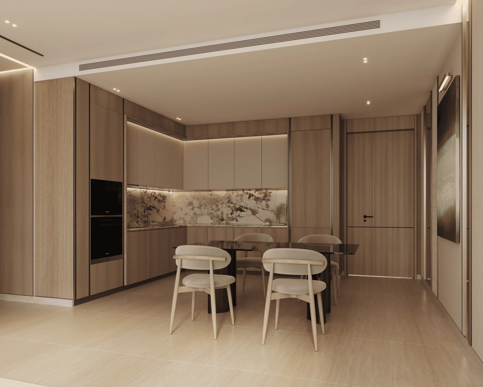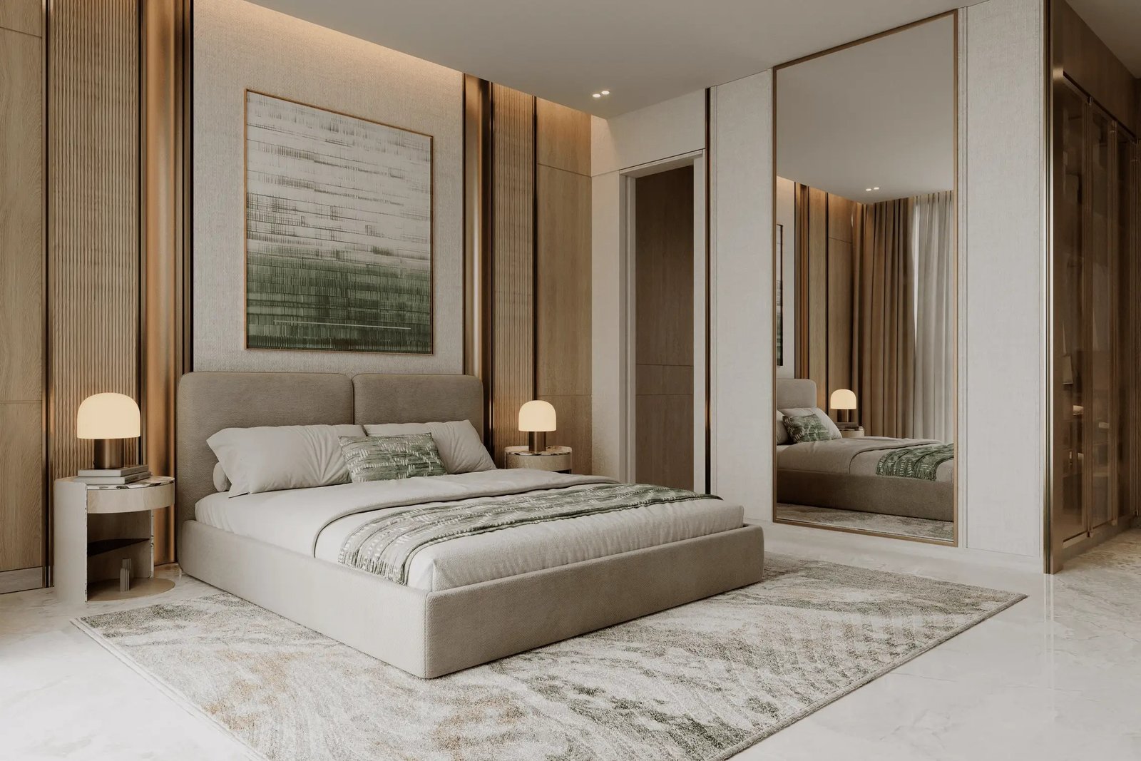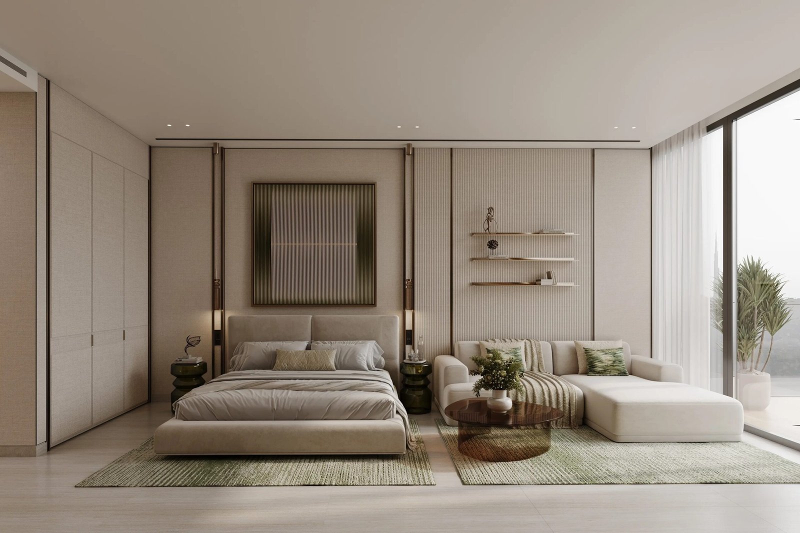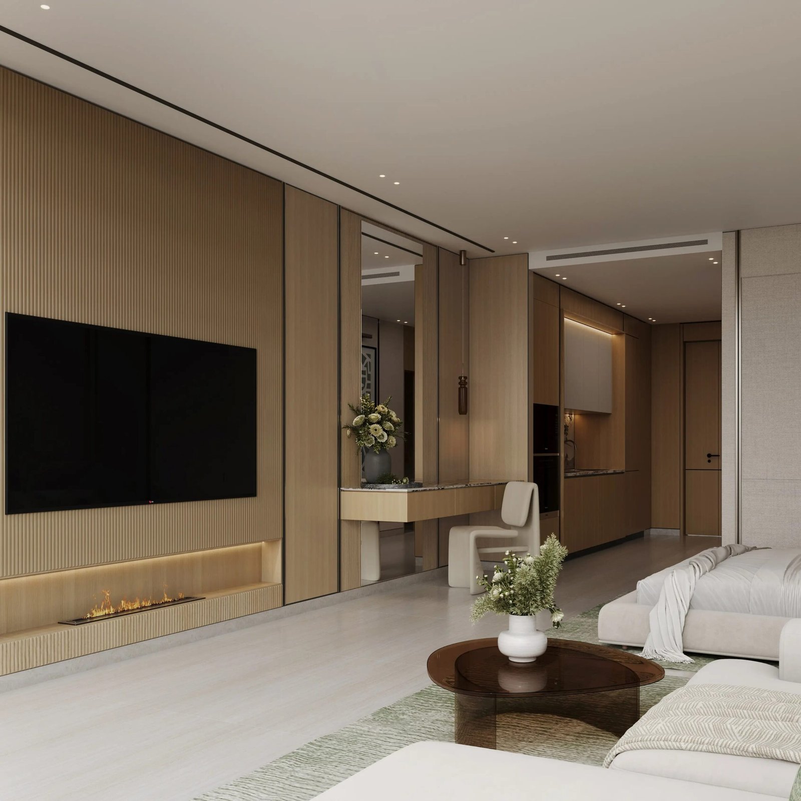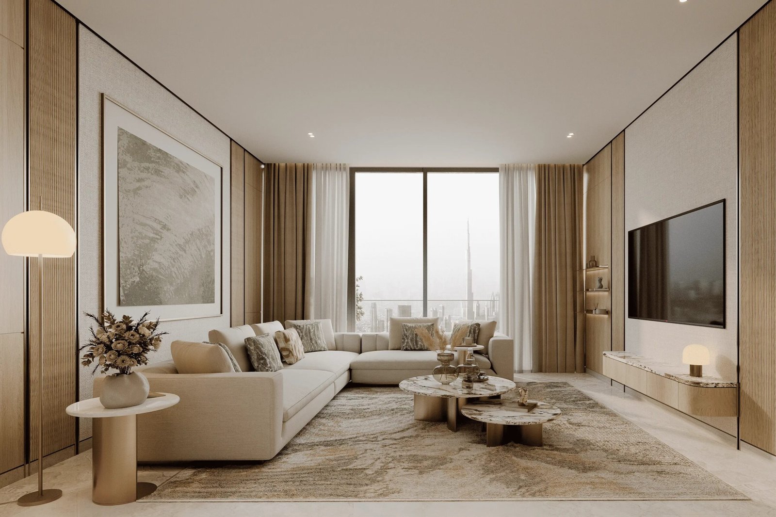 Inside Binghatti Titania, each apartment has been designed using a light-toned color palette that enhances the sense of space and openness. Large panoramic windows allow maximum natural light to flow into the interiors, making the living spaces brighter, fresher, and more welcoming. The use of premium materials and carefully selected finishes ensures durability, comfort, and aesthetic appeal.