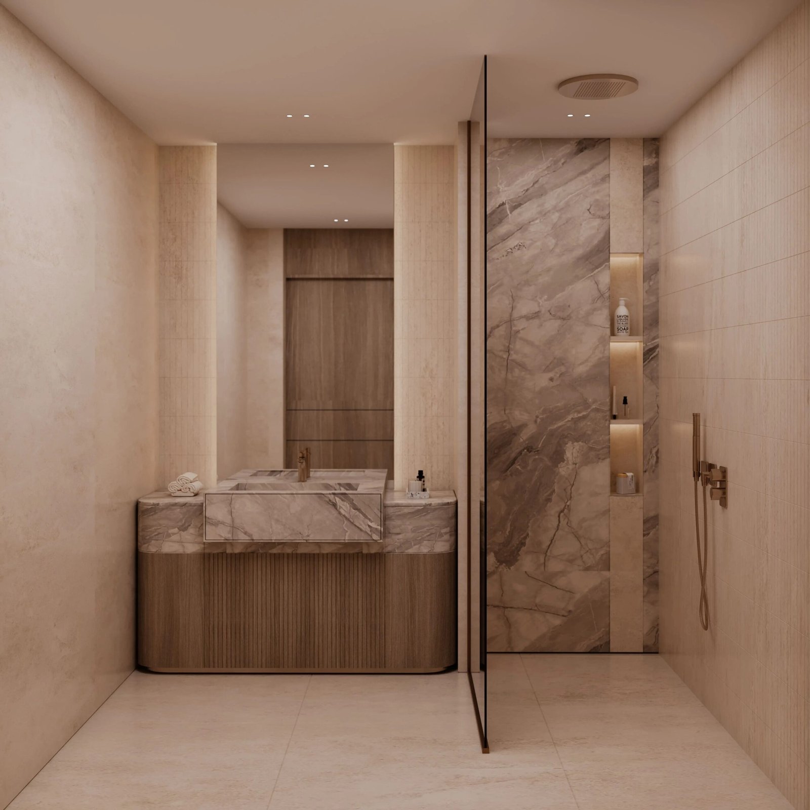 The interior composition of Binghatti Vintage is crafted with warm tones, stone textures, glass elements, and bronze finishes. These materials contribute to a calm, harmonious, and spacious ambiance inside each apartment. The project blends modern living with natural materials, delivering a comfortable and timeless residential atmosphere.