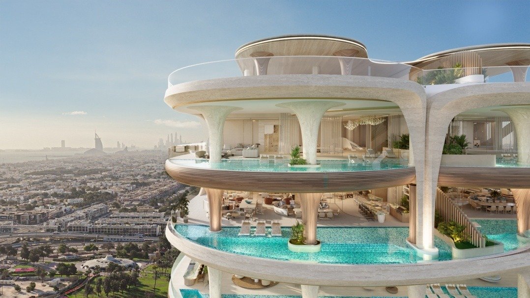 The project features 3-bedroom penthouses, 4–5 bedroom Sky Villas, 6-bedroom Sky Mansions, and 6-bedroom Sky Palaces. -