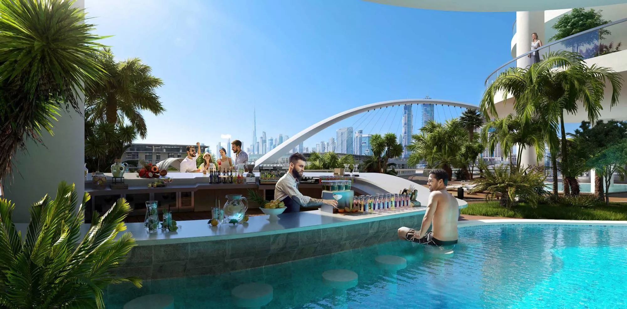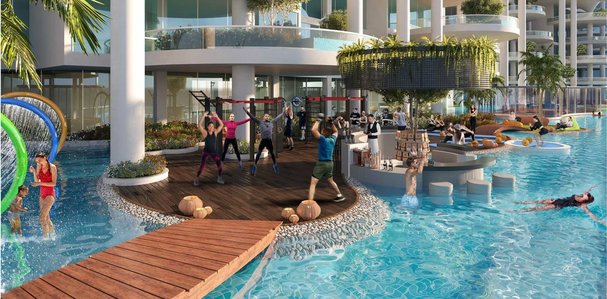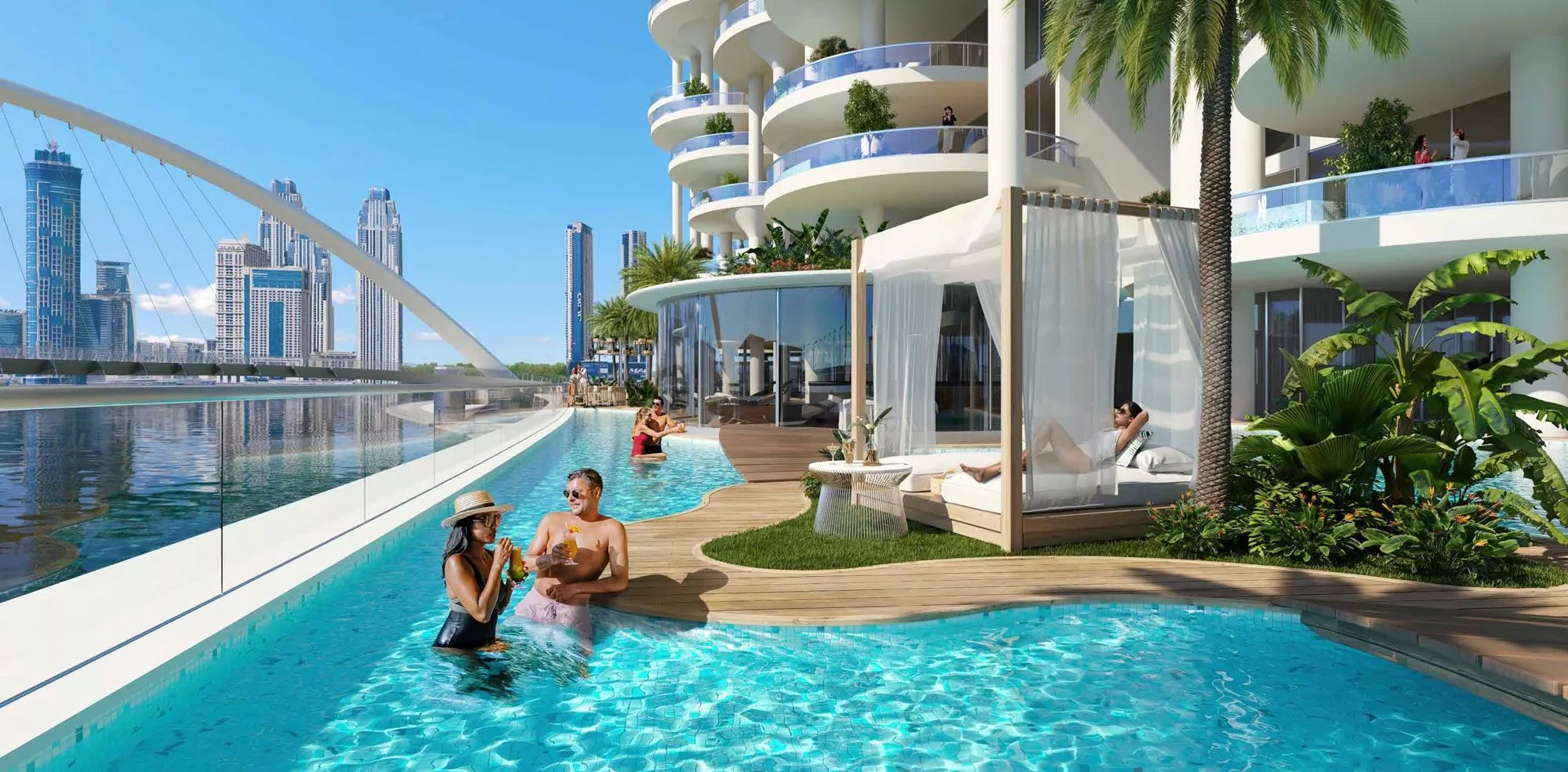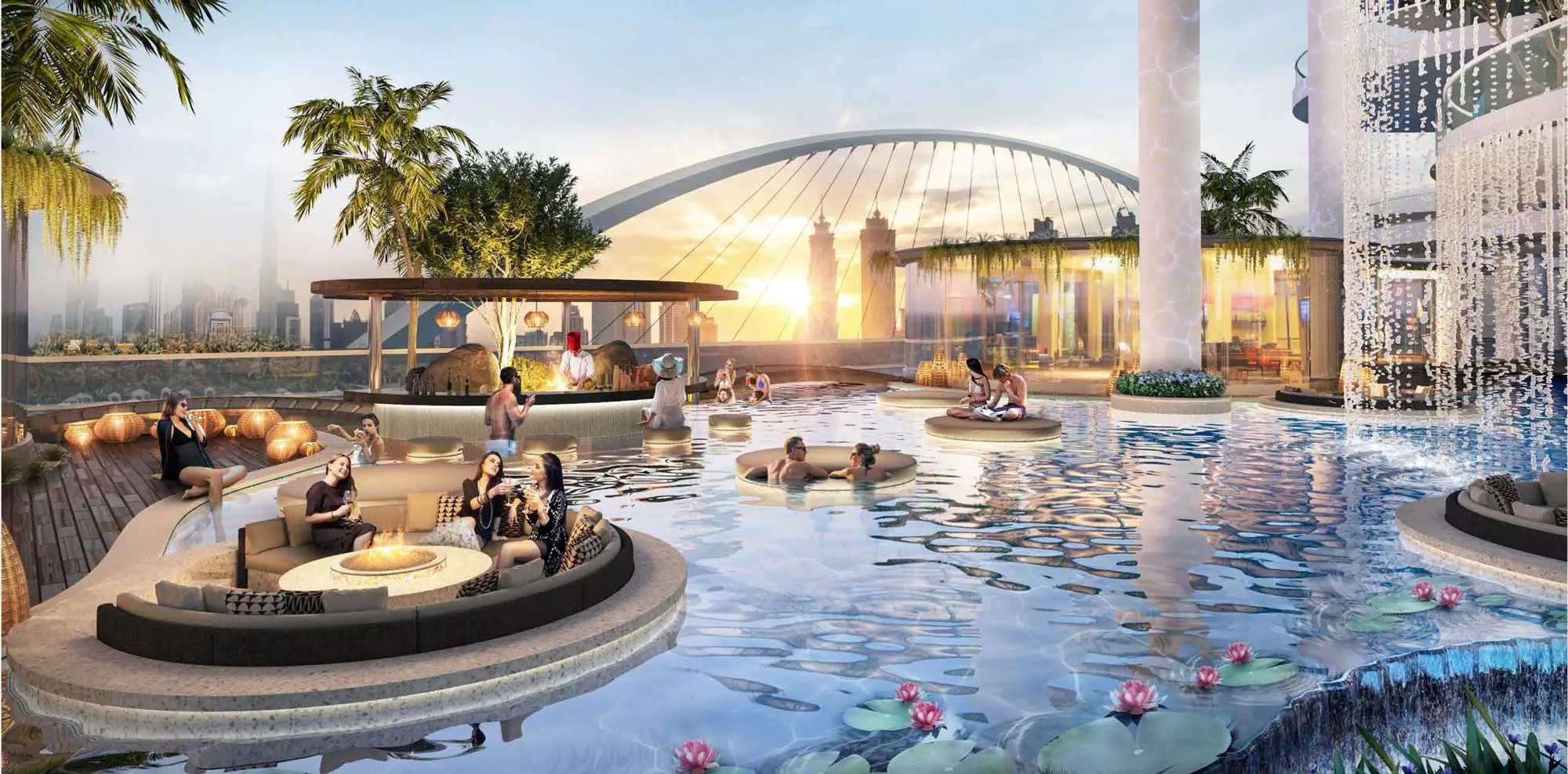 The development recreates the ambiance of the Amazonian rainforest with cascading waterfalls, tropical garden features, and jungle-inspired interiors, while still boasting panoramic views of Safa Park and the canal.