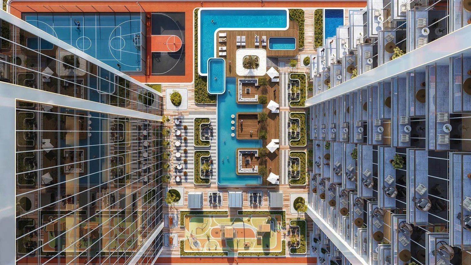 The project includes pools, gyms, sports courts, gardens, lounges, coworking spaces, retail outlets, and more. -