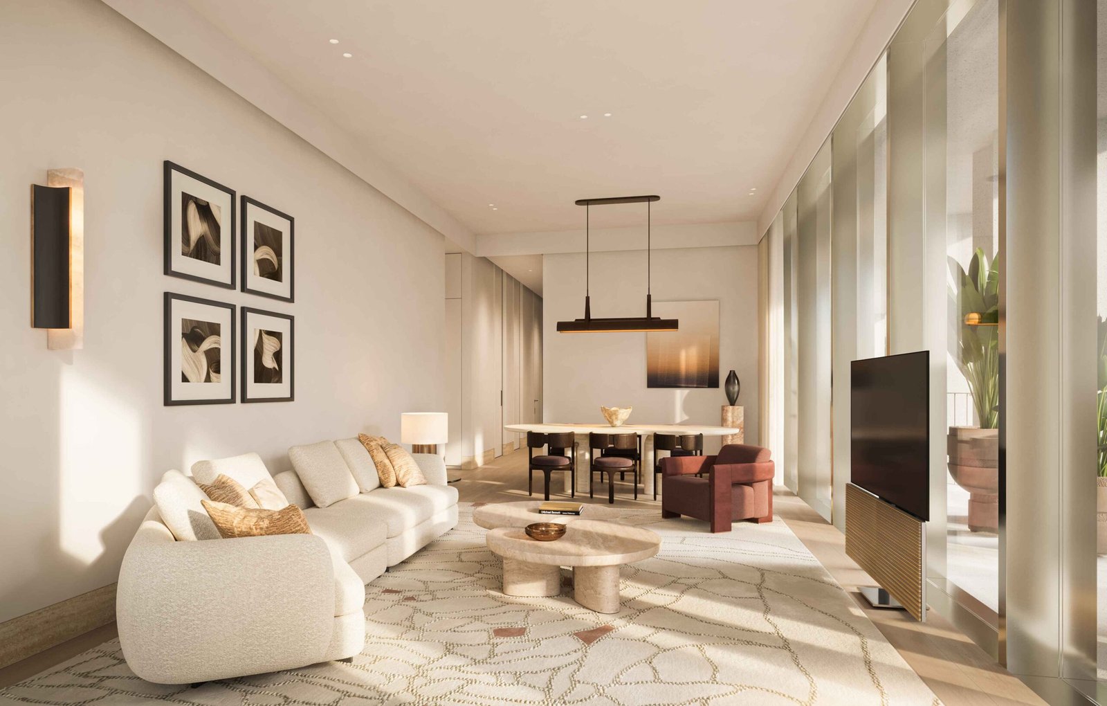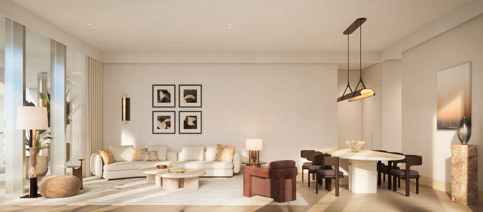 The interiors reflect a deep respect for modern sophistication. A predominantly monochrome palette elevates the play of shadows and light, revealing the richness of materials such as natural stone, polished marble, and warm textured wood. Stone mosaics add fine artistic detail to selected areas, emphasizing quality craftsmanship. Each residence in Eden House Za'abeel is planned to maximize spaciousness, natural ventilation, and views of the surroundings. The overall interior style resonates with quiet luxury and understated opulence.