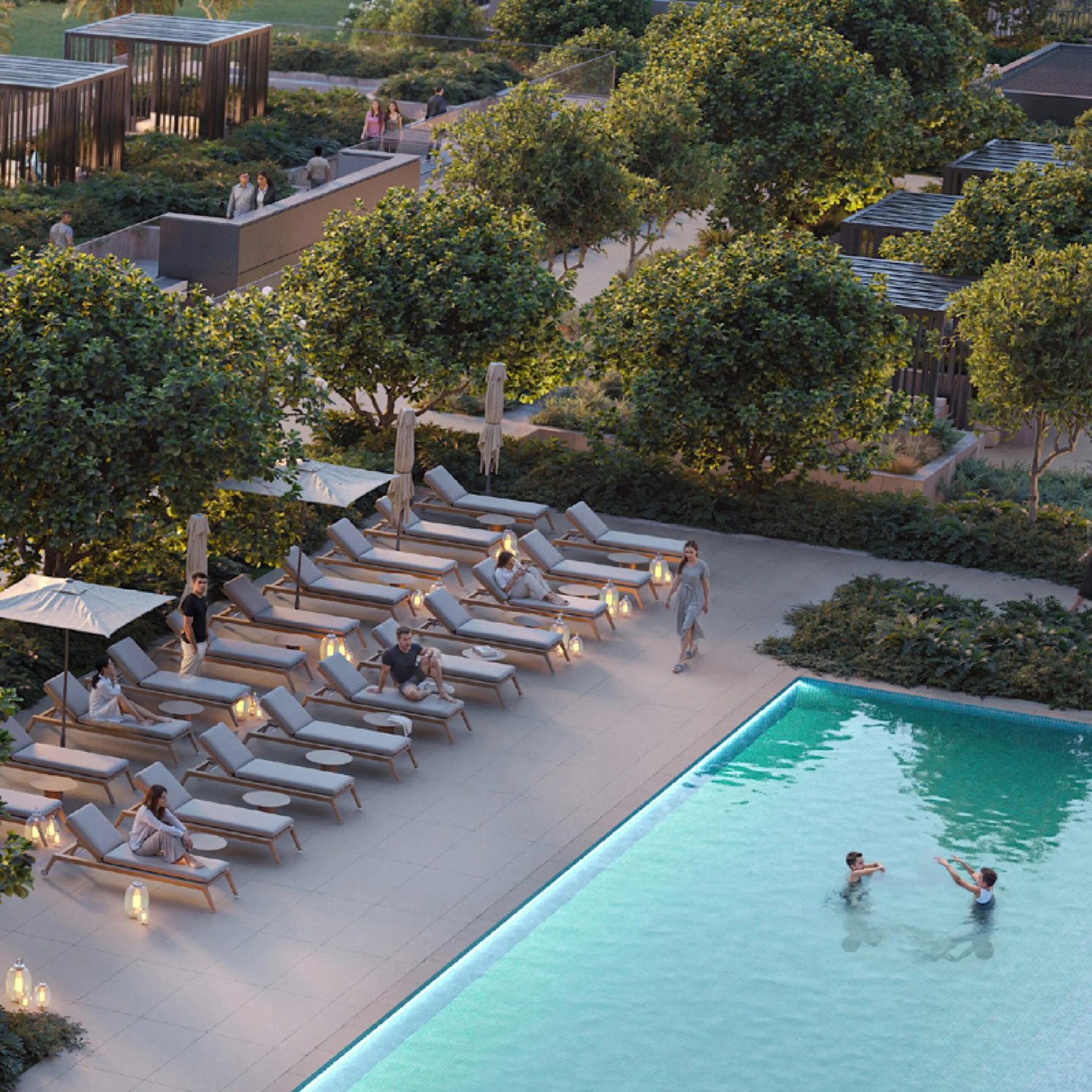 A large pool designed for leisure and relaxation with sun decks that offer a calm environment for residents.