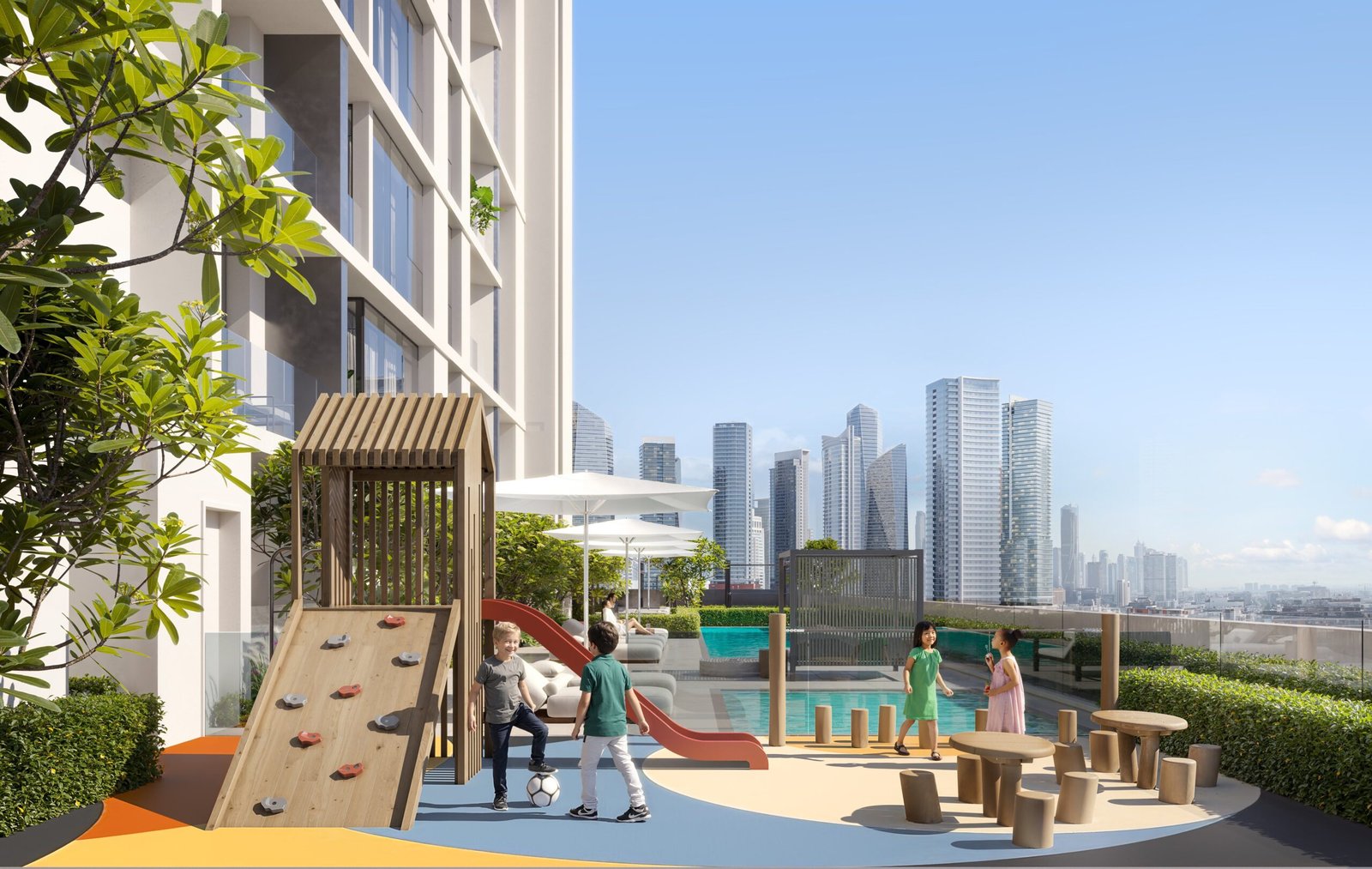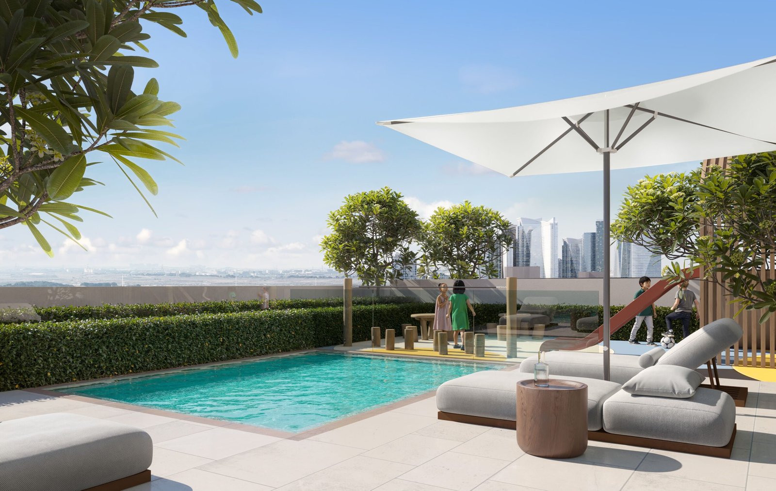 A separate children’s pool ensures a safe and enjoyable space for young residents to play and swim.