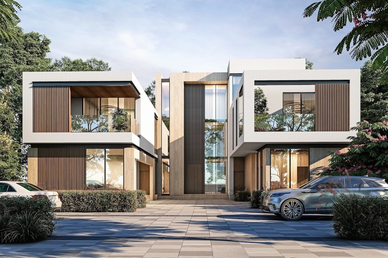 Outdoor living is equally impressive, with private gardens and swimming pools that enhance the sense of privacy and luxury. The private garages accommodate up to three cars, adding to the convenience and security of the residents.