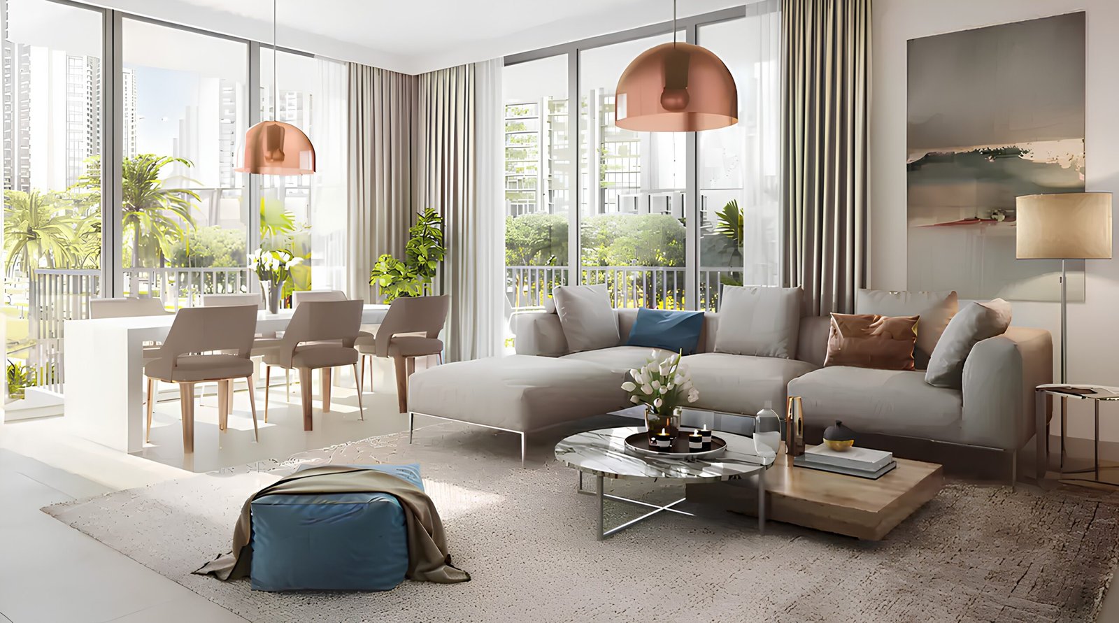 The Island Park 2 Dubai Creek Harbour apartments are delivered with full finishes, premium fittings, and large panoramic windows. According to listings, the apartments boast modern contemporary facades, open-plan living spaces and high-quality internal design and bathroom fixtures.