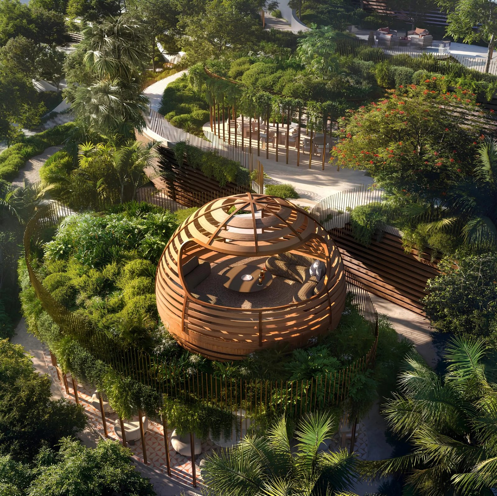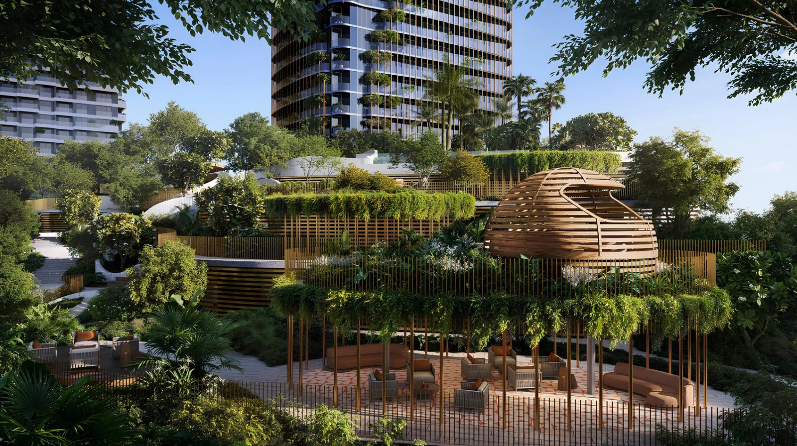 A landscaped podium area inspired by nature, filled with greenery, shaded seating, and pathways designed for relaxation.