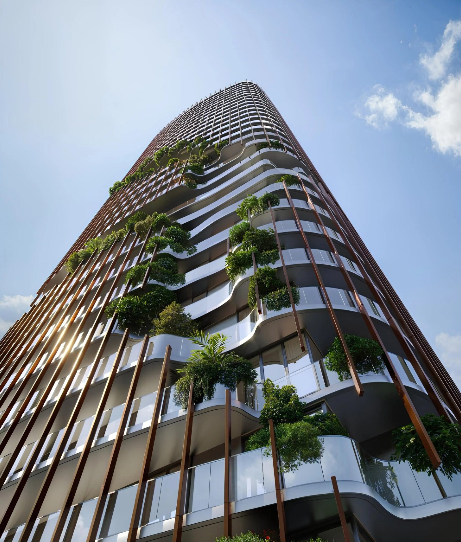 The distinctive double-layered façade is one of the key highlights of Kanyon by Omniyat. It features an internal insulated wall system complemented by a beautifully designed exterior of bronze aluminum slats. These bronze elements add texture, depth, and sophistication to the tower. A continuous green vertical ribbon rises from the podium level towards the top, reinforcing the project’s forest-inspired ambience and making Kanyon by Omniyat one of the most visually compelling developments in the district.