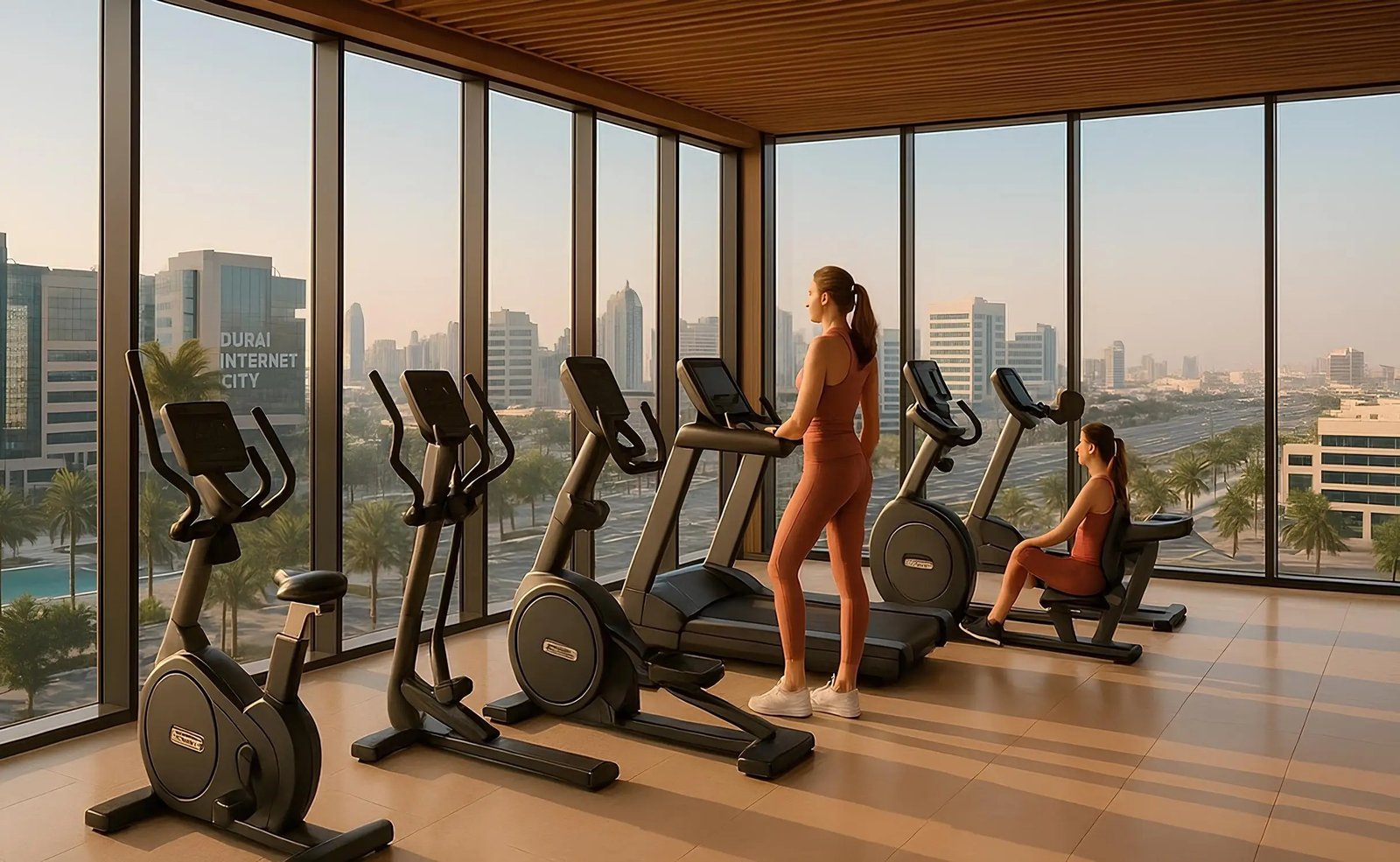 A fully equipped gym with expansive views of the surrounding district, designed to support modern fitness routines and promote an active lifestyle.