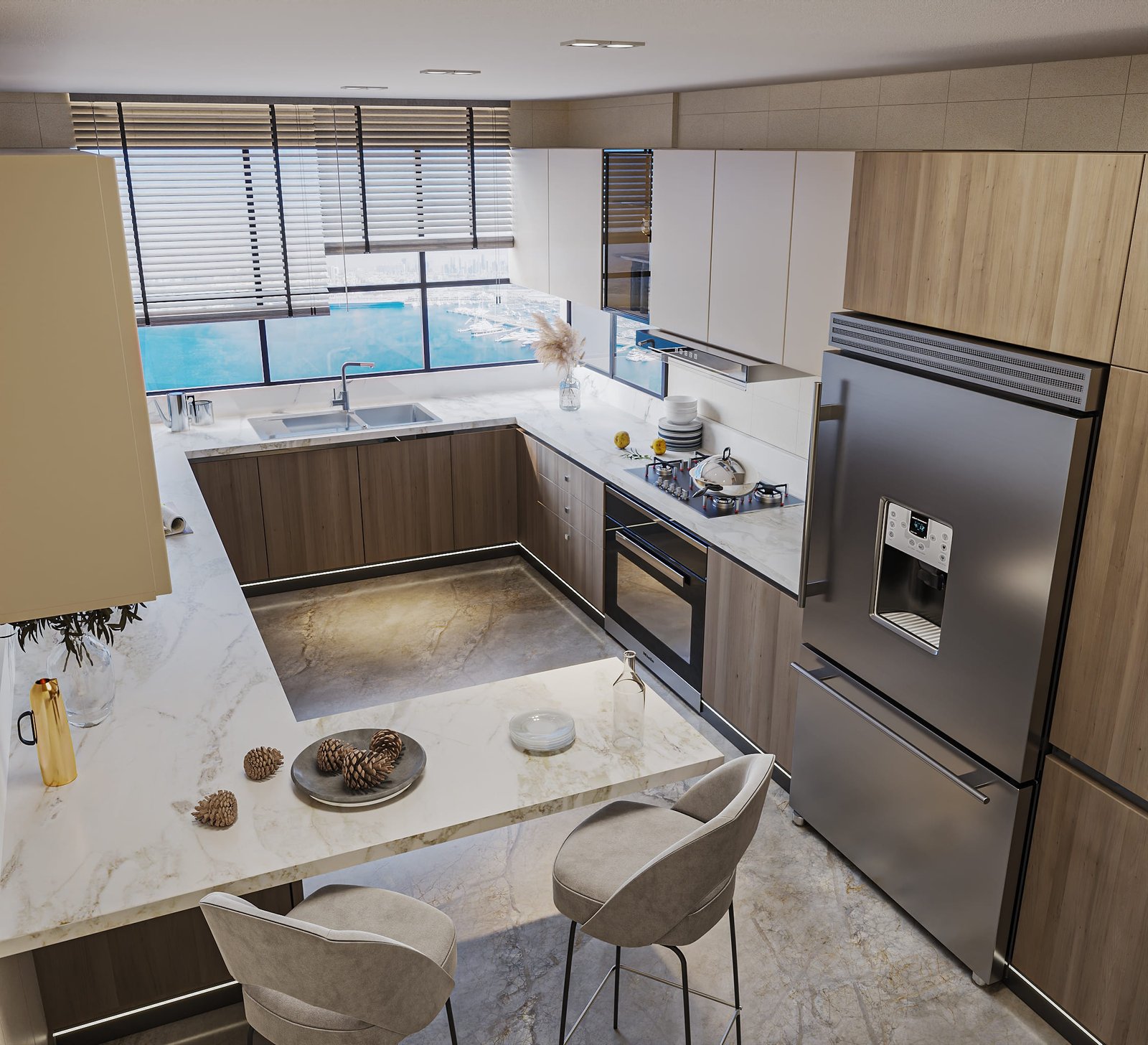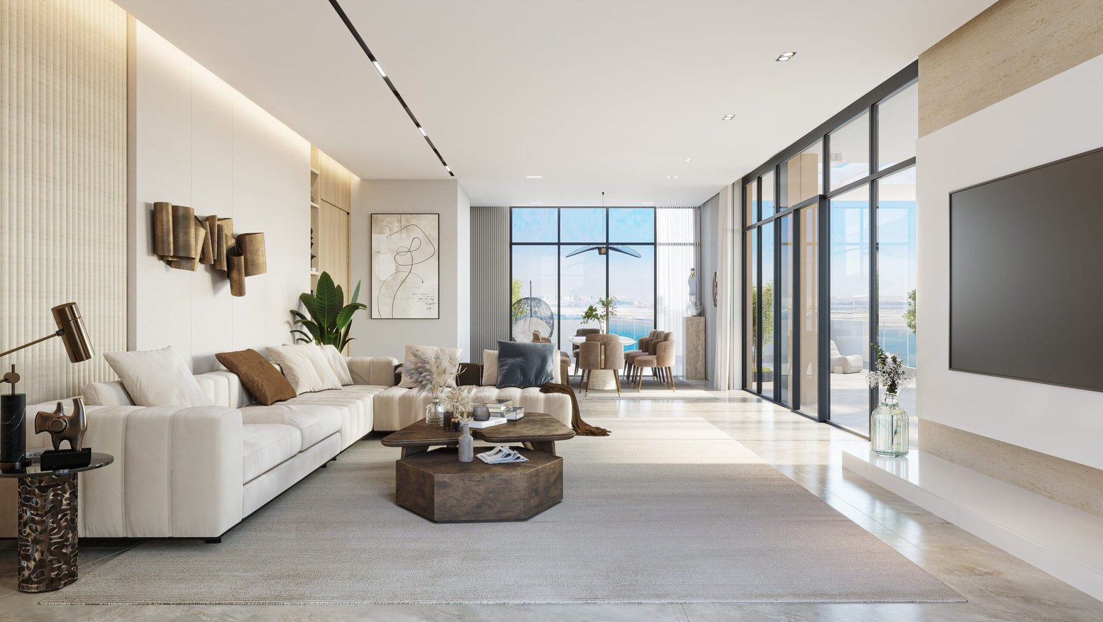 Riva Residence features a diverse selection of luxury apartments available in 1-bedroom, 2-bedroom, and 3-bedroom configurations. Each unit is designed to maximize space efficiency and provide a seamless blend of comfort and elegance. The interiors use a soft, warm color scheme complemented by white ceiling finishes and expansive windows. These elements enhance natural lighting and offer stunning views of the Persian Gulf.