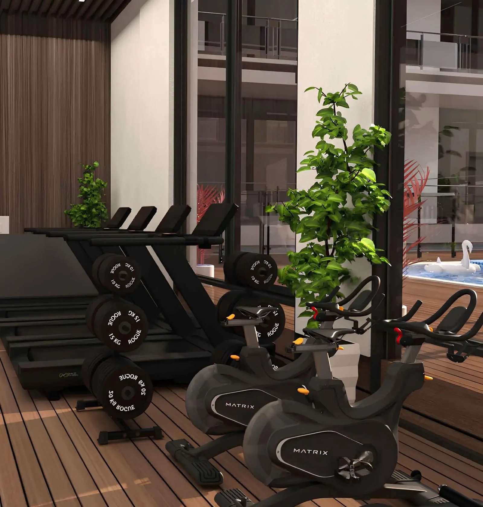Dedicated spaces for kids encourage safe outdoor activity and community interaction within a secure environment.Modern Gym