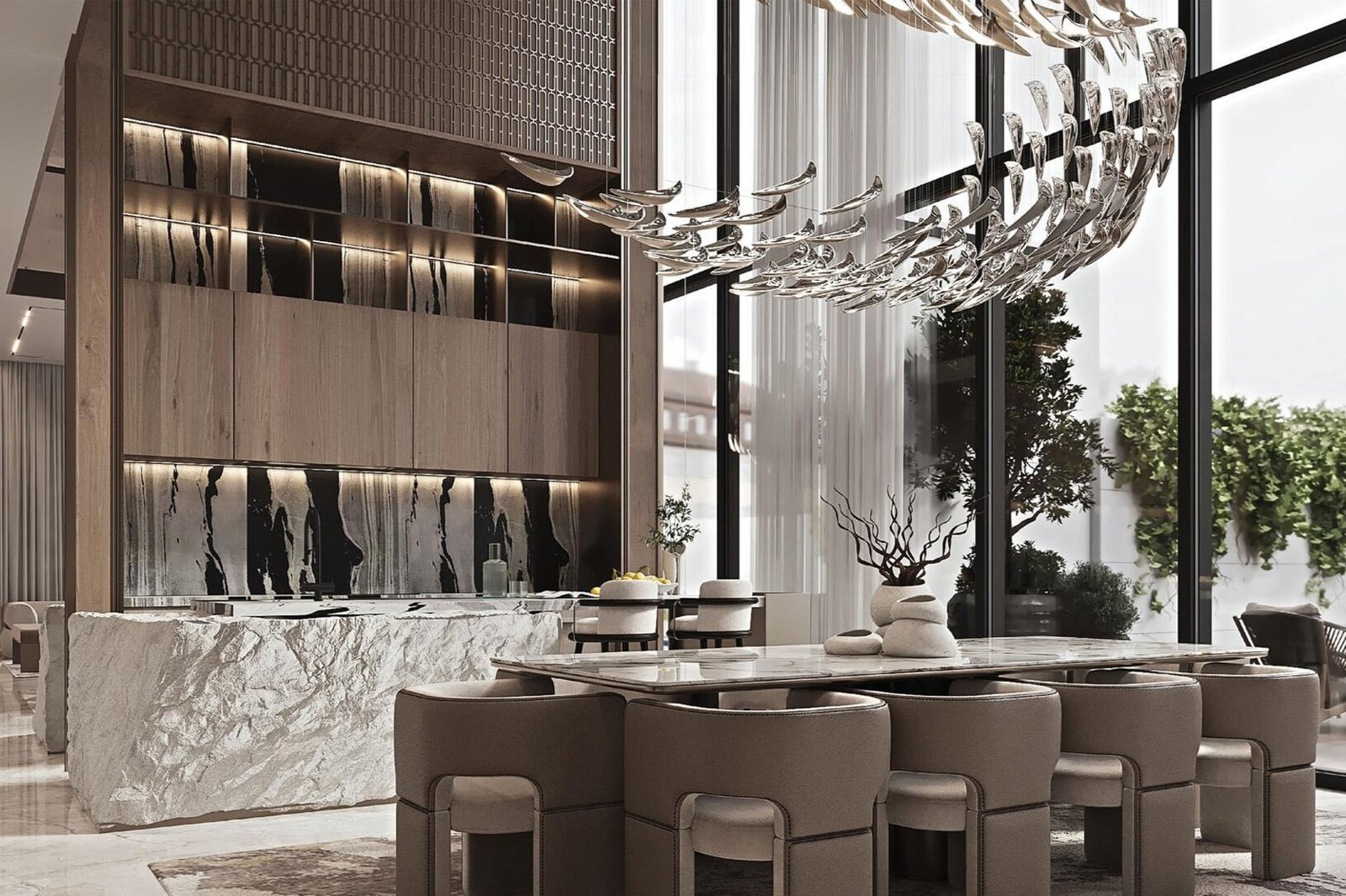 Selora Residences stands as a testament to sophisticated design and refined living in one of Dubai’s most prestigious locations. Developed by Swank Development, the project combines minimalist architecture with Portuguese-inspired design elements. The villas’ exteriors showcase crisp white facades paired with natural stone finishes, enhanced by expansive panoramic windows that invite natural light to flood interiors.
