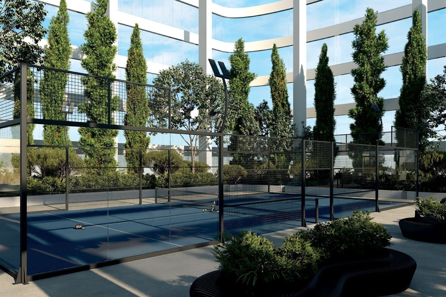 A specialized padel court offers residents an opportunity to engage in this fast-growing sport, fostering community interaction and fitness.Library and Business Center
