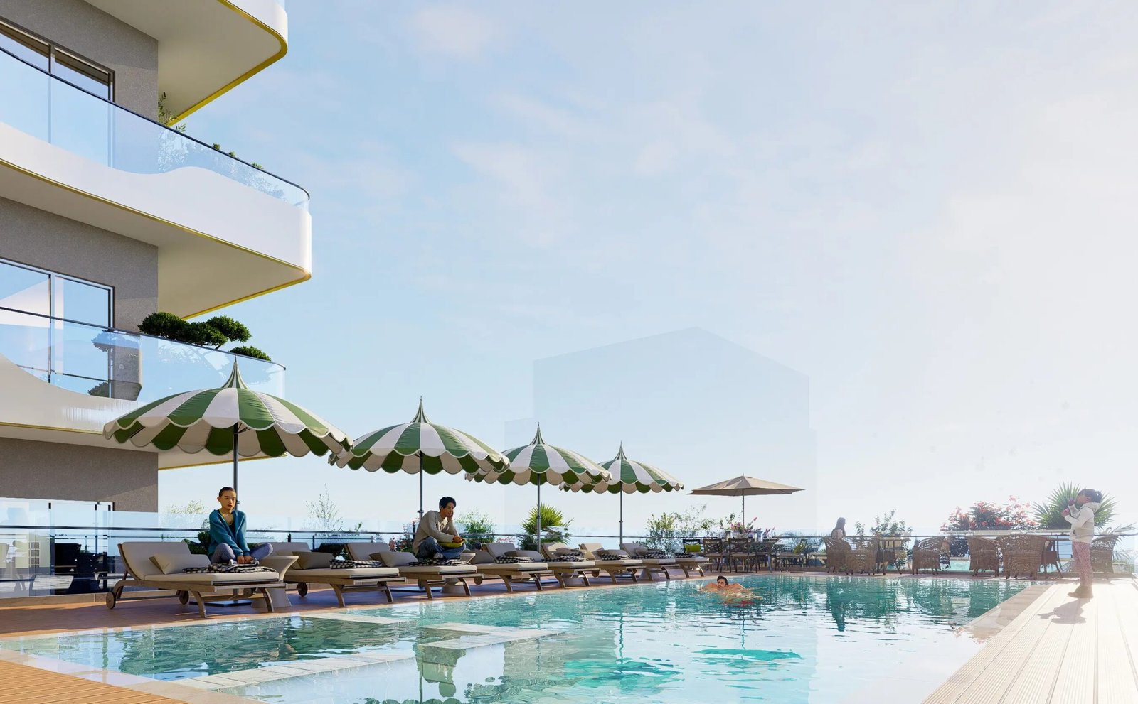 A shared swimming area with lounge seating for residents seeking relaxation or social time.
