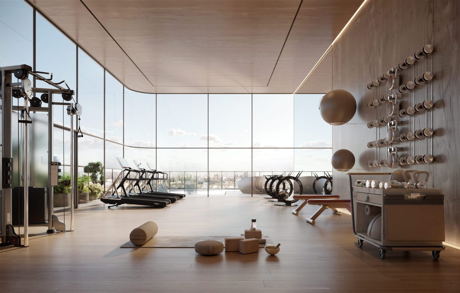 A fully equipped fitness center offers modern equipment for strength training, cardio, and wellness activities.