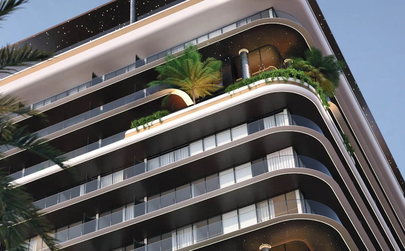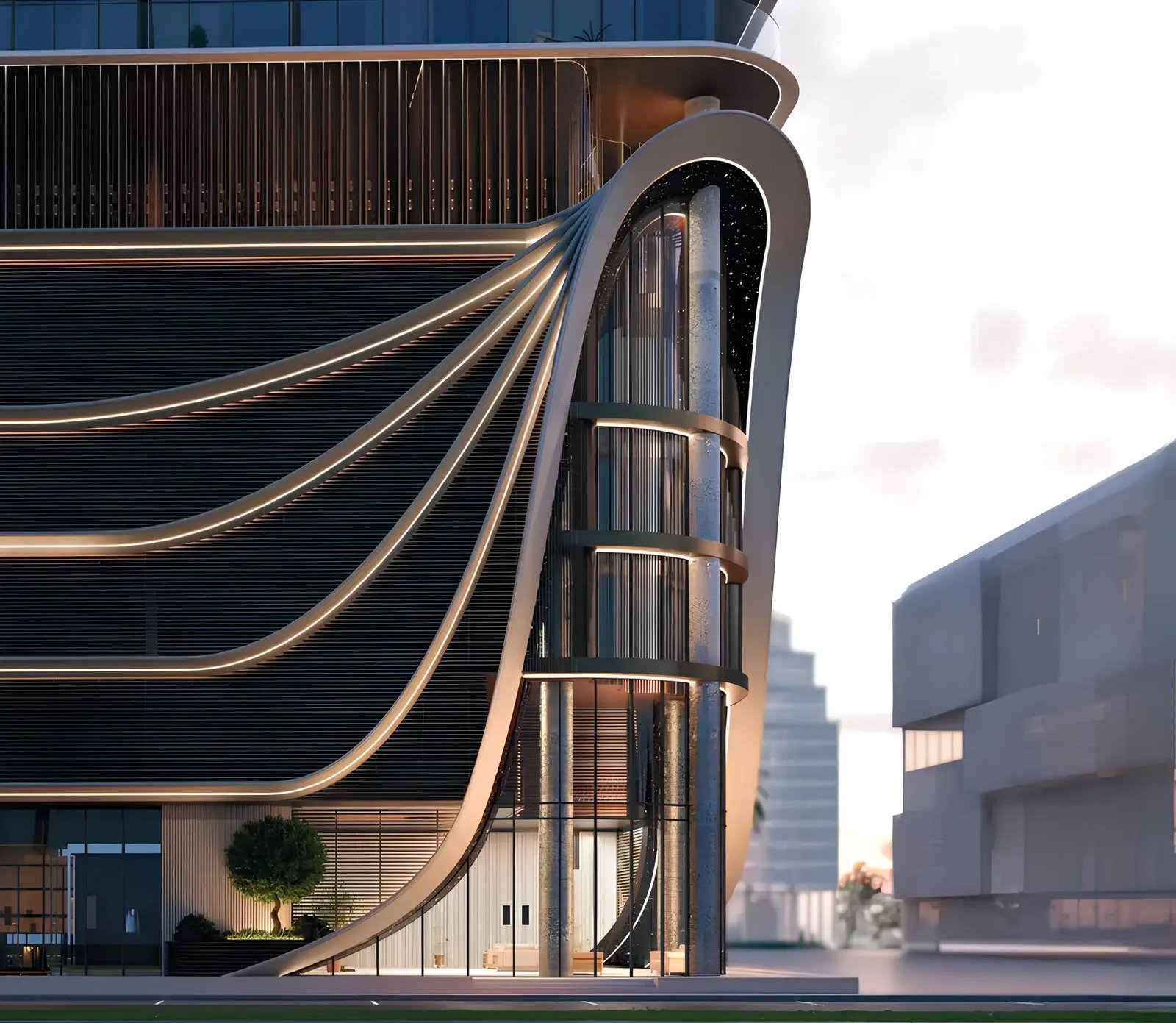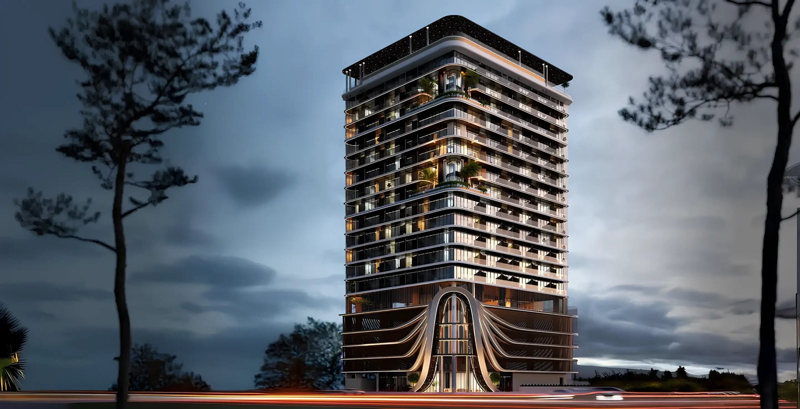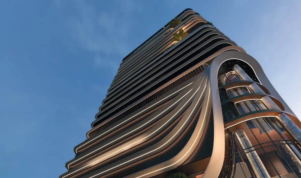 The exterior of the project is characterised by a bold modern design that exudes elegance and emphasises its uniqueness. The building is decorated with wavy lines that create a sense of movement and fluidity, as well as façades with thoughtful lighting, which gives it a futuristic look. The building’s configuration includes a basement level, a ground floor, a four-level podium, a floor with shared facilities, 13 residential floors and a roof.