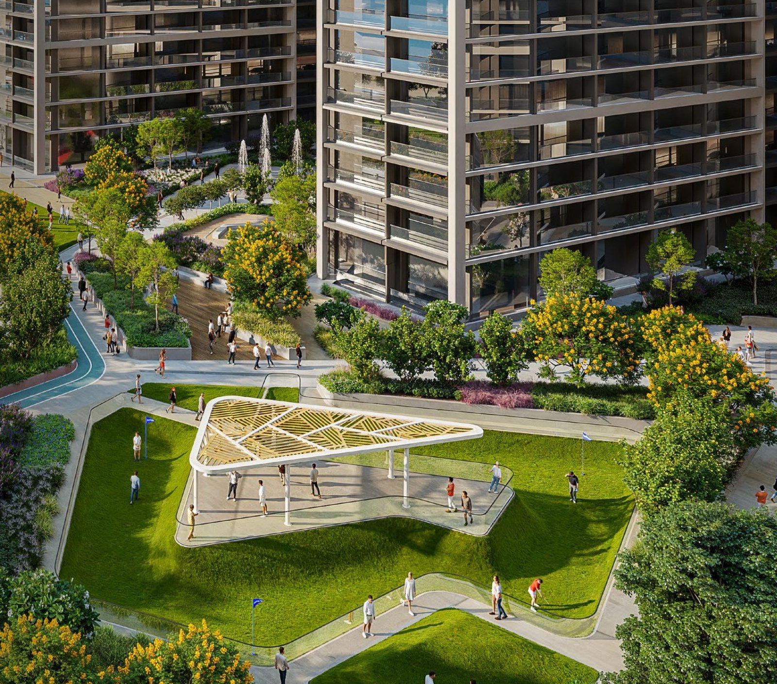 The overall ambience within The Eden at Sobha Central is curated to evoke a sense of calm and elegance. High-quality materials, refined finishes, and modern fittings are used across all interiors. The podium area enhances community life with landscaped gardens, walkways, seating zones, and green courtyards complete with art installations and an amphitheater.