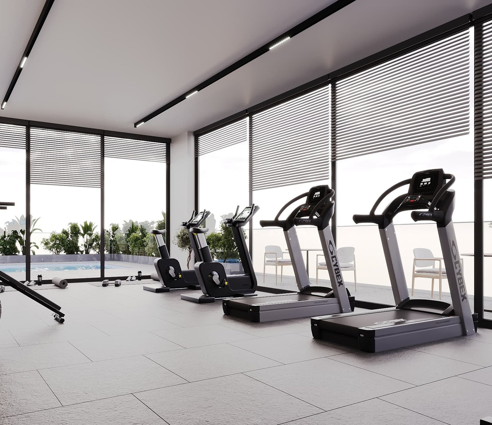 The modern gym is equipped with high-quality exercise equipment and benefits from natural lighting.