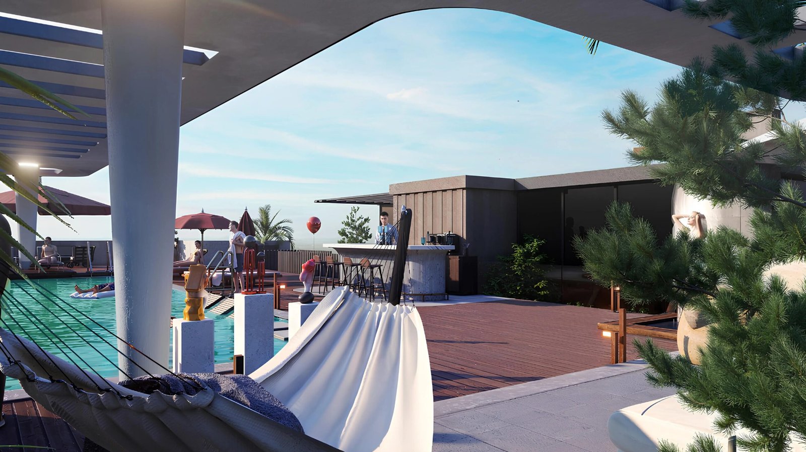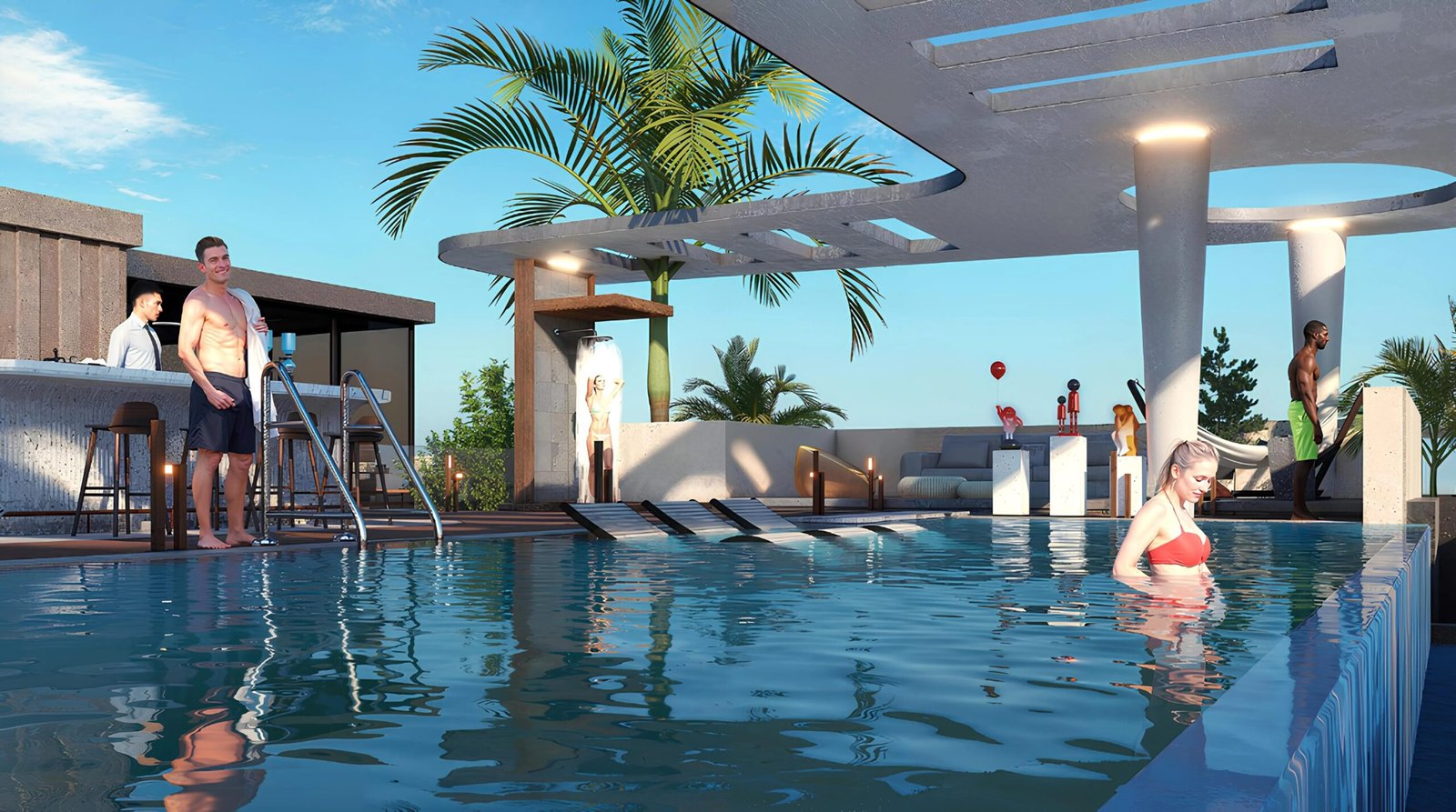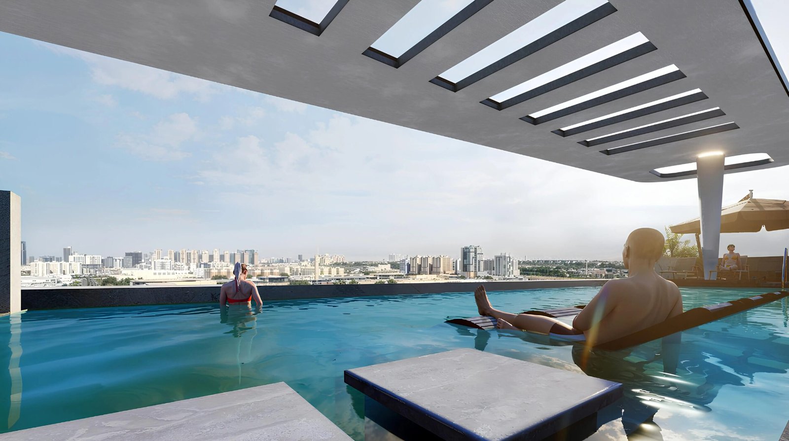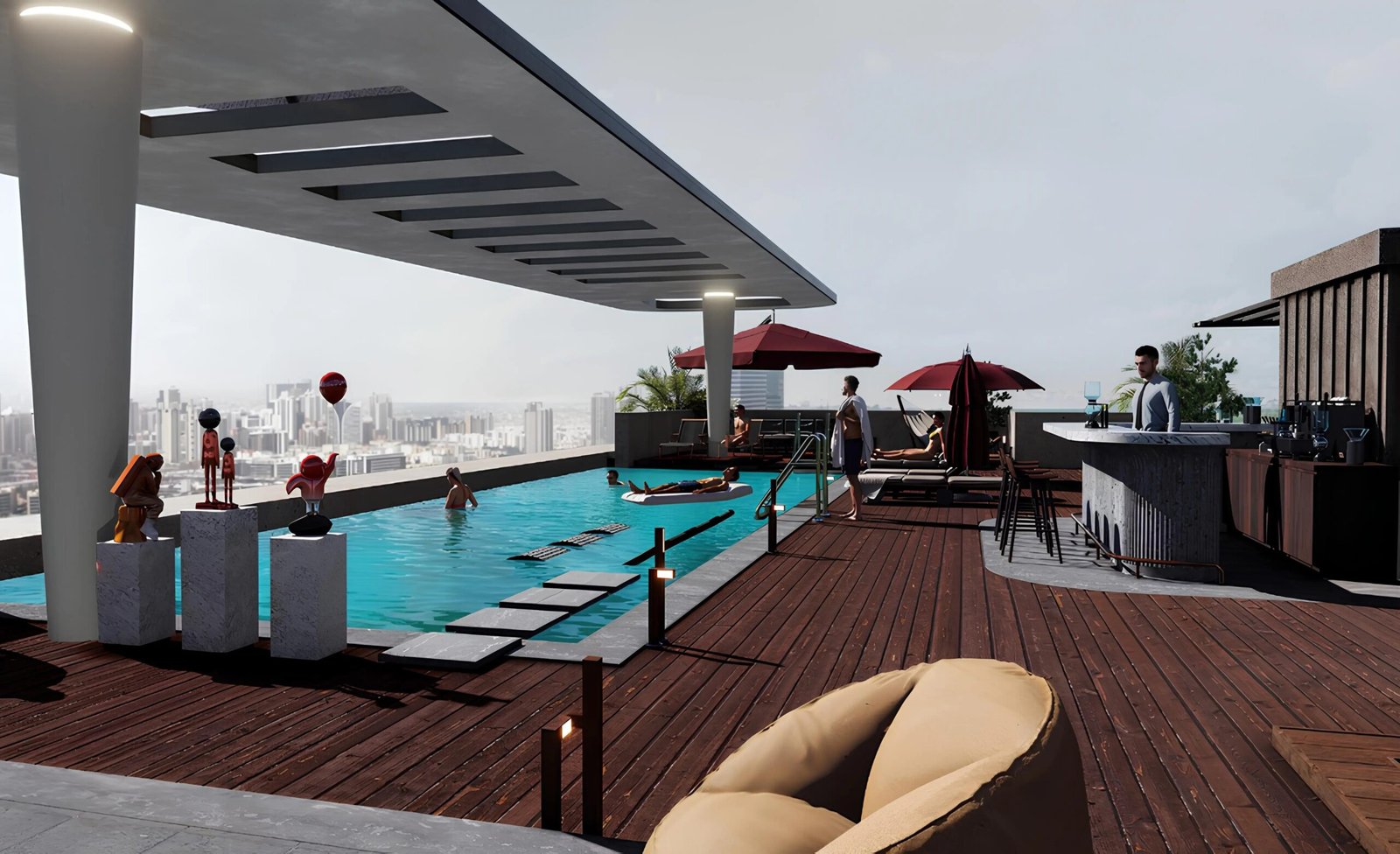 The stunning infinity pool on the rooftop provides a serene setting for relaxation with panoramic views of the city. It is perfect for leisure swimming, sunbathing, and social gatherings in a stylish environment.
