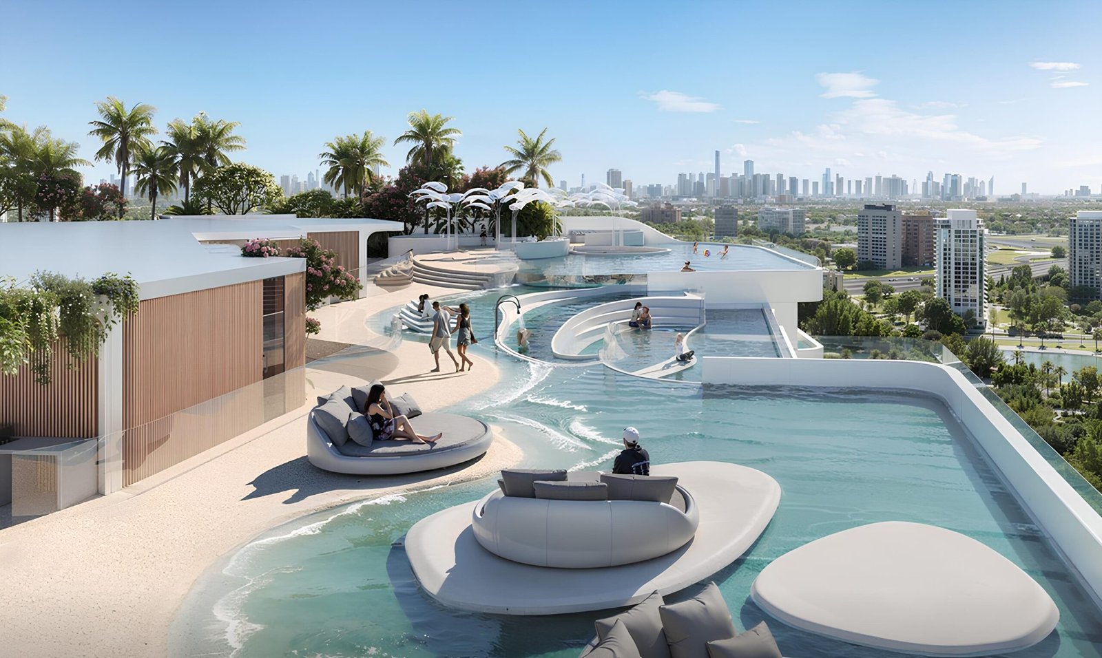 The project’s structure, including multiple podium levels and 15 residential floors, ensures every apartment benefits from exceptional design quality, abundant daylight, and a sense of privacy. Each residence at Weybridge Gardens 4 includes a private pool, creating a rare residential offering in Dubai’s mid-luxury segment. Interiors feature high-quality materials, contemporary finishes, spacious layouts, and premium fixtures that enhance comfort and functionality.